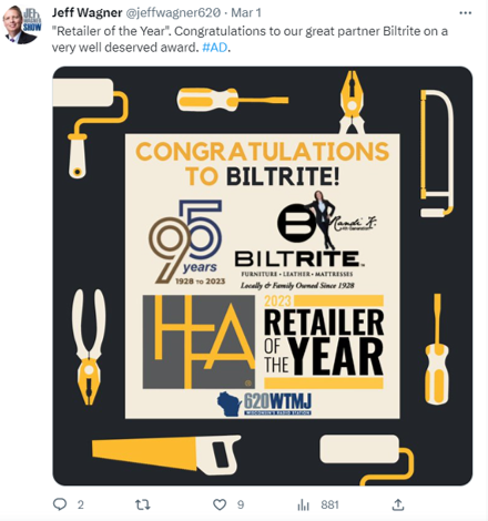 This recognition by the HFA is, at once, humbling and touching as we embark upon our 95th year in business. We must pay tribute to our founding family members who founded BILTRITE as a small storefront located at 3rd and Garfield Street in downtown Milwaukee, to our second-generation family members who brought BILTRITE to the famous shopping district on Mitchell Street on the southside of Milwaukee for a 58-year run that ushered in the 3rd generation to our latest home of 17 years on Layton Avenue on furniture row in Greenfield, Wisconsin. Now led by our 3rd and 4th generations along with our amazing team, BILTRITE continues to be locally and family owned. Thank you to our past and present employees, our loyal customers, HFA, Furniture First Buying Group, and the many vendors and Amish builders with whom we have nurtured relationships over the years! We have come a long way since 1928 and look forward to continuing to be a locally and family-owned Metro Milwaukee-area institution! We do what we do because we love and have passion for what we do! Remember - BILTRITE’s one location always saves you money! #buylocal