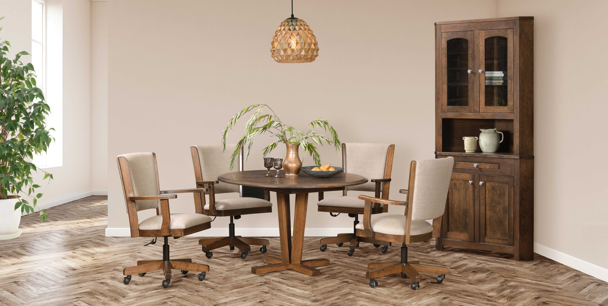 Affordable Ohio Amish Made Kitchen & Dining Sets In Stock or Customize Your Piece: Size, Height, Shape, Wood & Finish. Strong & Durable Catalyzed Varnish Finish Create Your Own Set – Endless Options! •8 Wood Species •Over 100 Finishes •Table Size, Shape, Height & Number of Leaves •Leg Style •Chair Style (Wood, Fabric or Leather Seats) 5pc Amish Made Dining Sets On Sale From $2395 After Discount