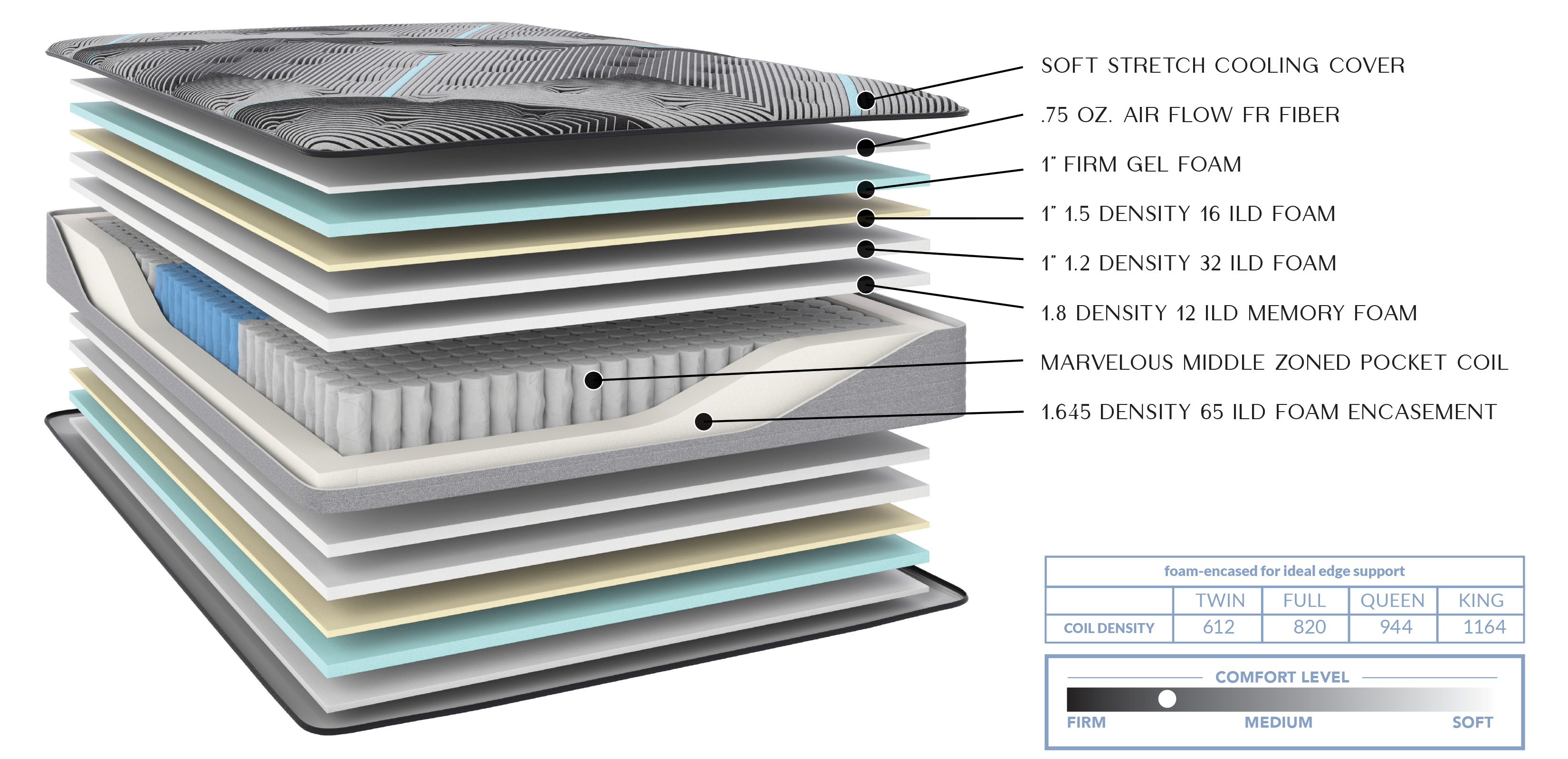 2-Sided Flip-Able Heavy Duty Mattress, Made in America. 15” Firm, Soft Stretch Cooling Cover, .75oz Airflow FR Fiber, 1” Firm Gel Foam, 1” 1.5 Density 50 ILD Foam, 1” 1.2 Density 32 ILD Foam, 1.8 Density 12 ILD Memory Foam, Marvelous Middle Zoned Pocket Coil, 1.645 Density 65 ILD Foam Encasement with Handles. Pricing includes your choice of a 9 Inch or 5 Inch Amish Made Foundation & FREE Mattress Protector – or – Heavy Duty Bed Frame.